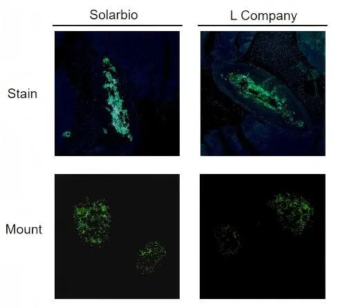 新型鈣鹽染色液采用四環(huán)素熒光探針,該探針能夠與鈣鹽中的鈣離子發(fā)生特異性結(jié)合。當探針與鈣離子結(jié)合后,其分子結(jié)構(gòu)發(fā)生變化,從而導(dǎo)致熒光特性改變,發(fā)出強烈且穩(wěn)定的熒光信號,在紫外光(DAPI通道)激發(fā)下呈現(xiàn)亮綠色熒光,與背景對比鮮明,特異性強,可以用于培養(yǎng)誘導(dǎo)成骨細胞和組織切片樣本的鈣鹽染色。